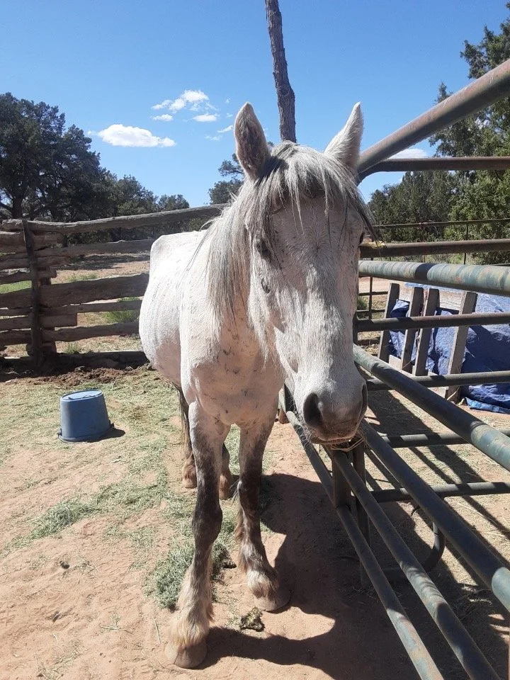 Thor was found with his leg stuck in a cattle guard on Dine (Navajo) land. He is the exception; most horses do not survive being trapped in these metal grates set into the ground. Some very kind Navajo Rangers were able to extract Thor from the cattle guard. From there he was taken to the Ramah Navajo community where generous vet techs cared for him while he recovered from his injuries. A friend of the Sanctuary reached out on his behalf, and Thor regained his freedom at Sky Mountain Wild in the spring of 2024. He survived because of the kindness of so many people who cared for him on his journey.