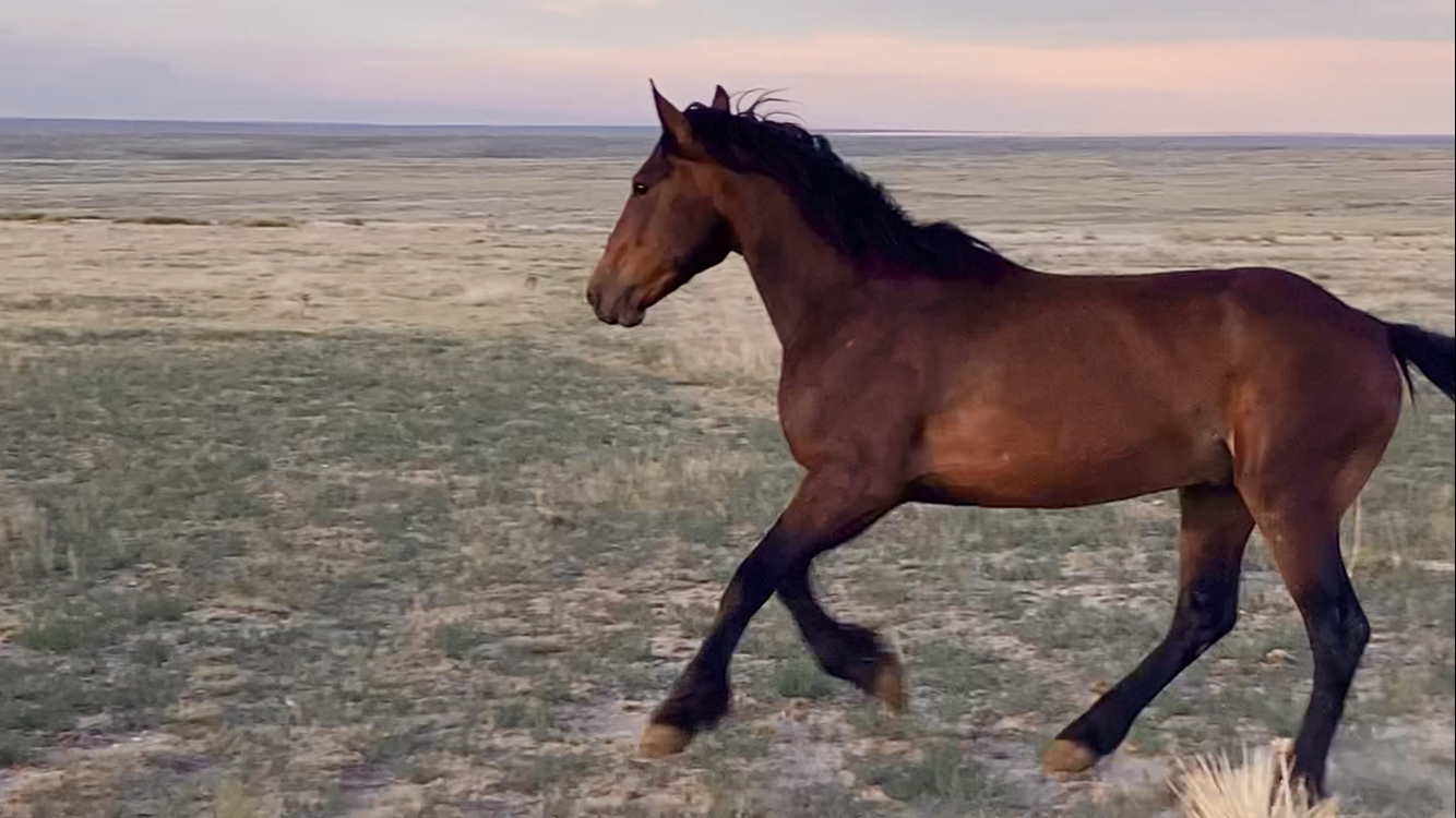 Kirei is the Japanese word for beautiful, a perfect name for a dark bay mare who was removed from public lands in 2022. This feisty 20-year-old mustang had lived her entire life roaming the range before she was rounded up and placed in a holding corral. She spent several months there, confined with no space to run free. Potential adopters passed her by, in part because of her age and because she was a true mustang, wild and untouched. Sky Mountain Wild staff chose to adopt Kirei and Astro, another elder mustang, to give them their best lives for however many years they had left.